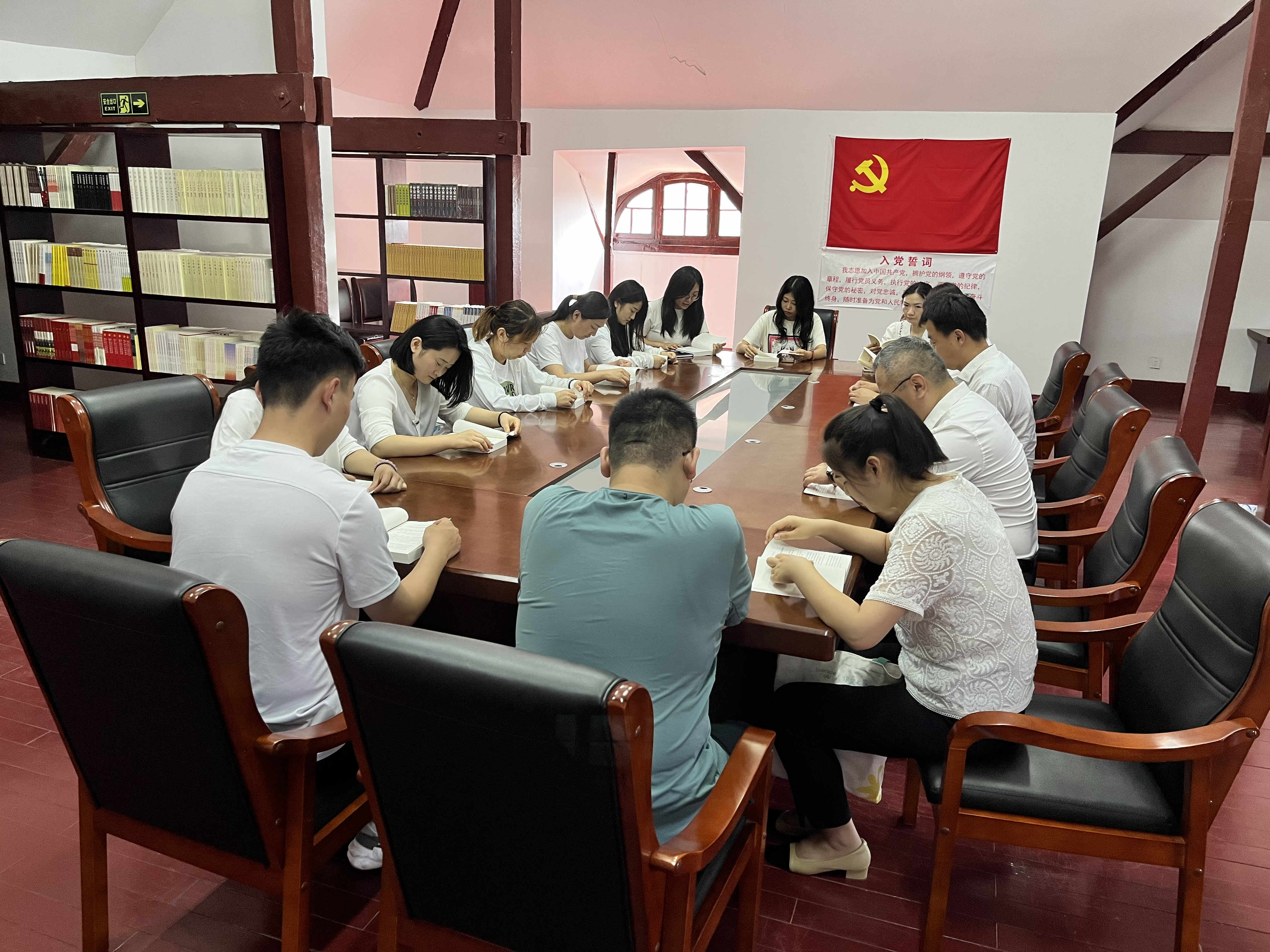 参观结束后,全体党员面对党旗,举起右手,庄严宣誓,大家的心一如加入中国共产党的那一刻赤诚。随后在纪念馆阅览室开展了一次特殊的主题教育集中学习,共同学习了《习近平新时代中国特色社会主义思想专题摘编》部分章节内容,并结合本次参观内容畅谈心得体会。