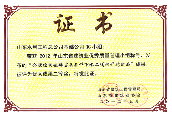 公司“合理控制破碎岩层条件下水工程隧洞开挖断面”等两项成果荣获2012年山东省建筑业优秀质量管理优秀成果二等奖