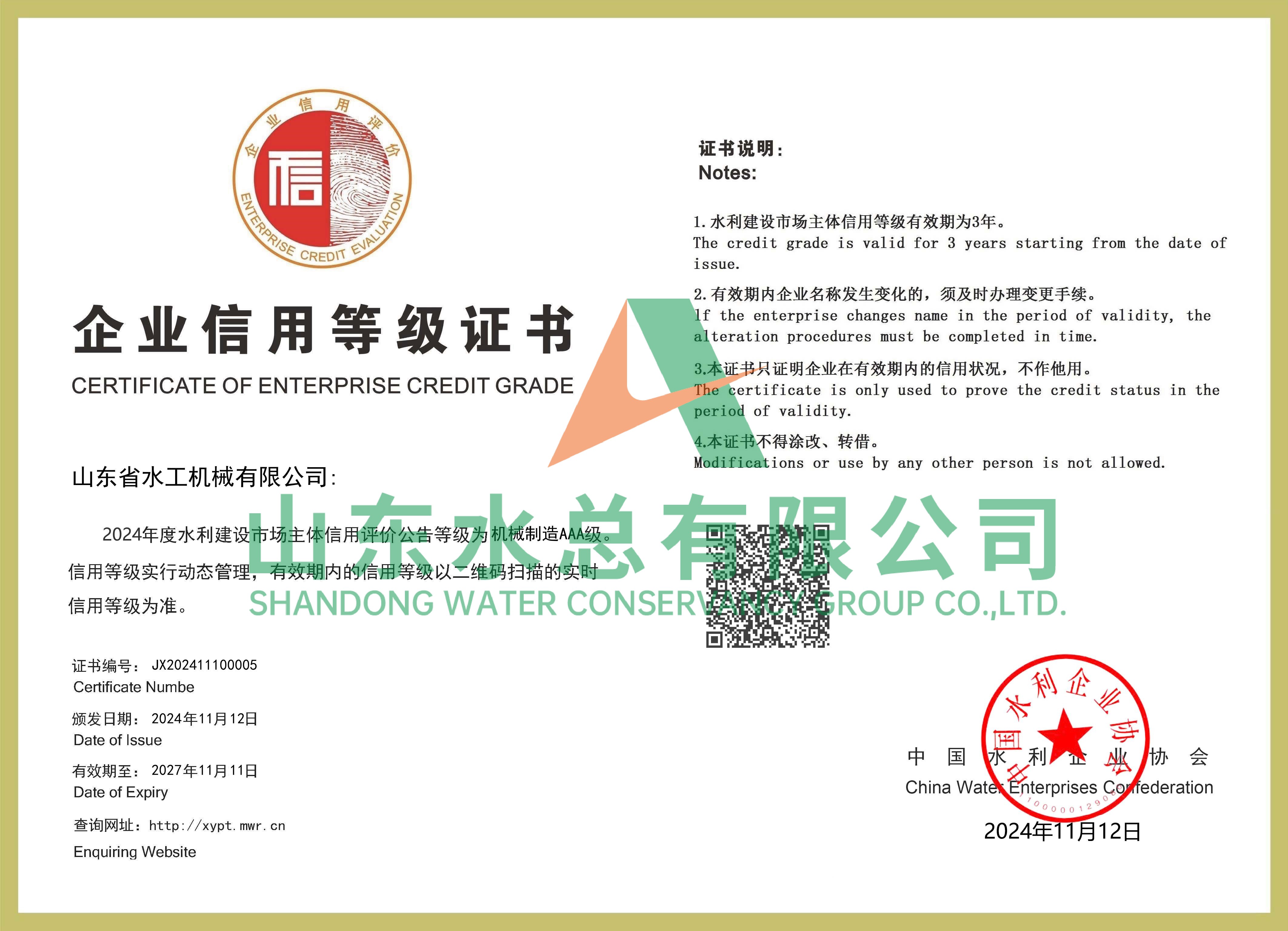 水利建设市场主体信用评价是水利部规范水利建设市场主体行为、加强行业自律的重要手段,其中“AAA”级为水利企业的最高等级信用状况,是衡量企业履约能力、投标信誉的重要因素,是企业综合竞争力最有力的证明。该荣誉的获得,是对水工机械公司诚信经营、质量品牌和服务的高度认可,对于公司大力开拓市场、提高市场竞争能力、推进企业高质量发展具有重要意义和推动作用。